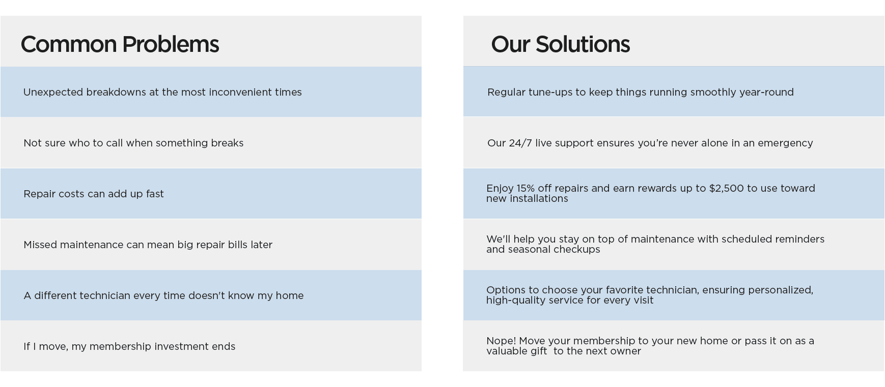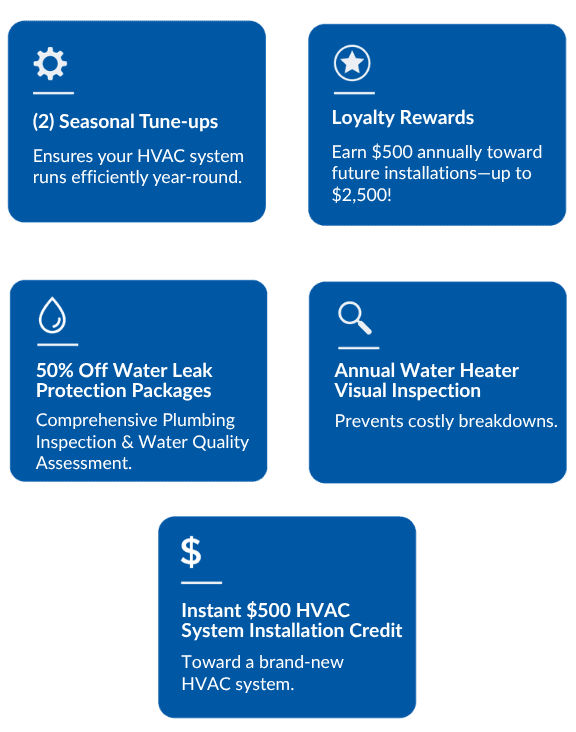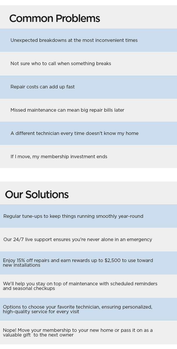 Unexpected breakdowns, rising costs, and the hassle of managing multiple service providers can leave you feeling overwhelmed. Comfort360 takes the stress out of home maintenance by providing comprehensive coverage for your HVAC and plumbing systems. With proactive maintenance, exclusive discounts, and 24/7 support, we help you stay ahead of costly repairs and ensure your home stays comfortable year-round. Say goodbye to surprises and hello to peace of mind with Comfort360.